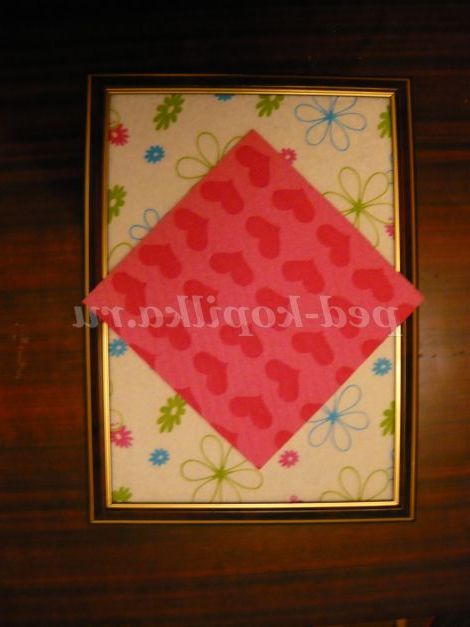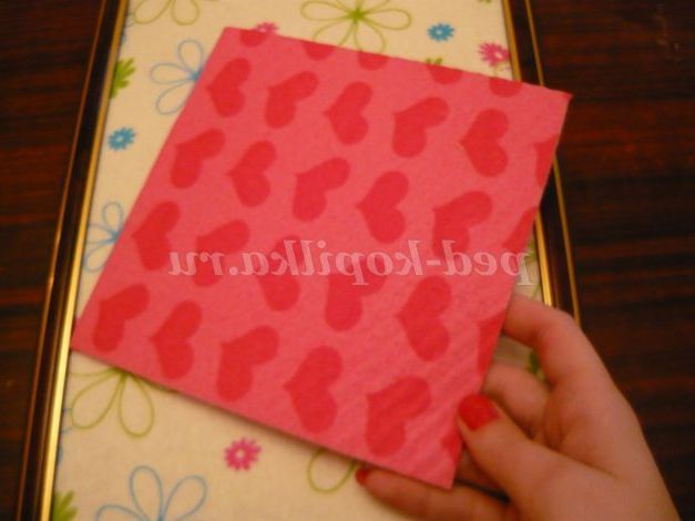1. Для початку візьмемо матерчату серветку, потрібного розміру, і приклеїмо її на картон від рамки. Таким чином, у нас виходить фон для рамки.