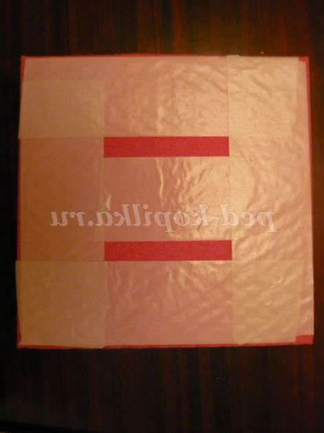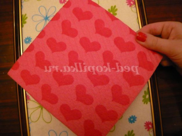 3. Потім двостороннім скотчем обклеюємо нижню сторону серветки і приклеюємо її до рамки у вигляді ромба.