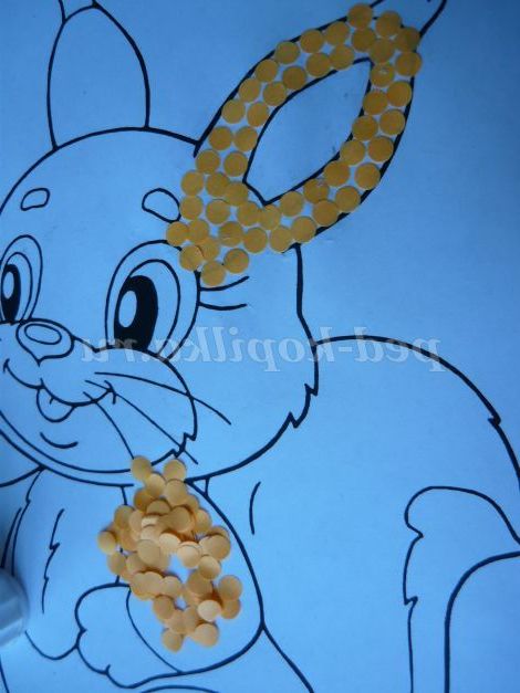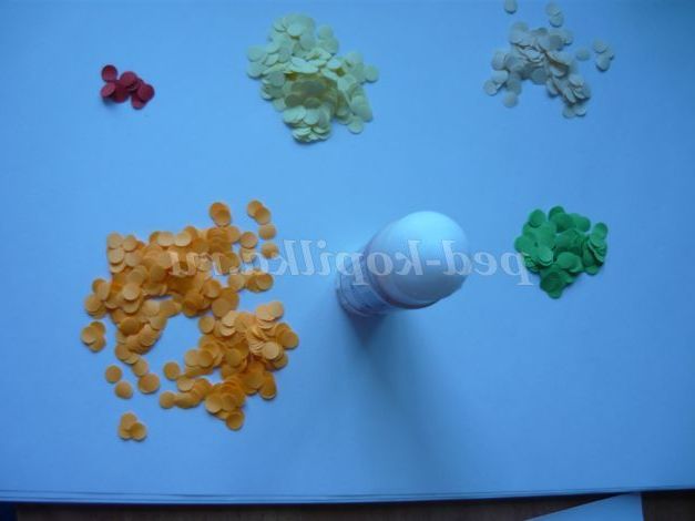 6. На промазані клеєм ділянки приклеюємо конфетті відповідного кольору.