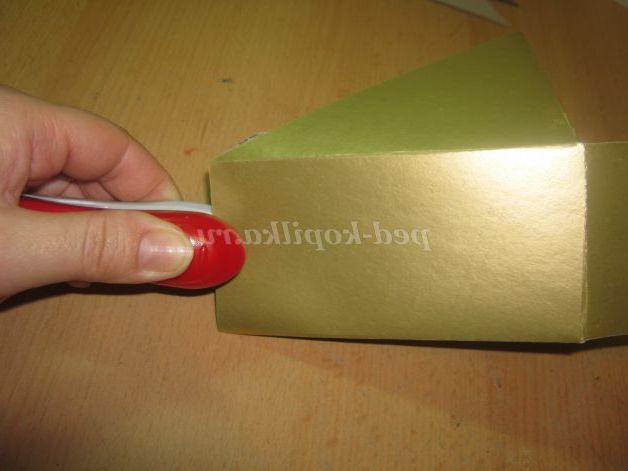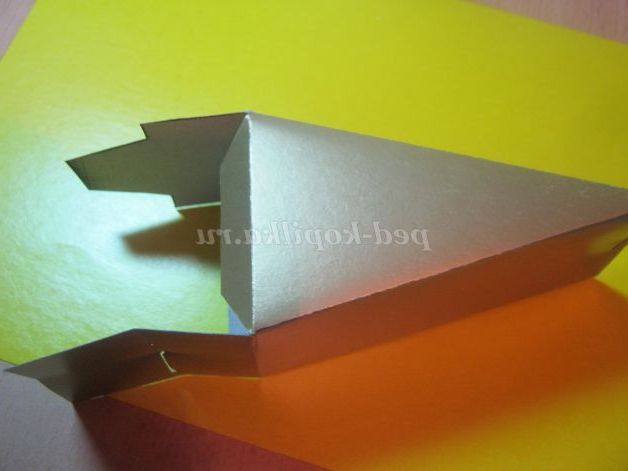 4. З'єднати гострий кінчик і закріпити степлером, з'єднати і закріпити бічній шов.Закрыть коробочку,вставивши клапан в проріз.