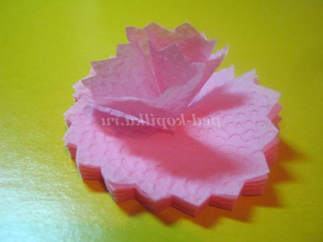 6. Вирізати коло з рівним або зубчастим краем.Собрать верхній шар і злегка стиснути, далі додавати по 1-го шару. 2-3 нижніх шару залишити,щоб було зручніше приклеювати