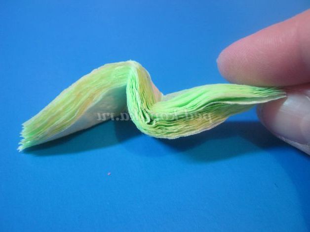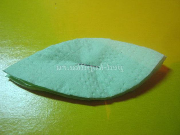 7. Для листочка з скріпленої серветки вирізати овал і загострити кінчики. Підняти вгору по 1-му шару і стиснути заклавши складку