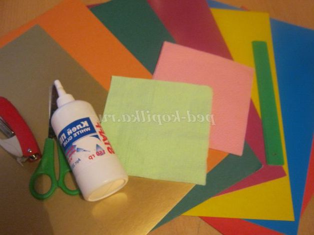 кольоровий картон, однотонні серветки (зелені,рожеві), клей ПВА, ножиці, степлер, лінійка.