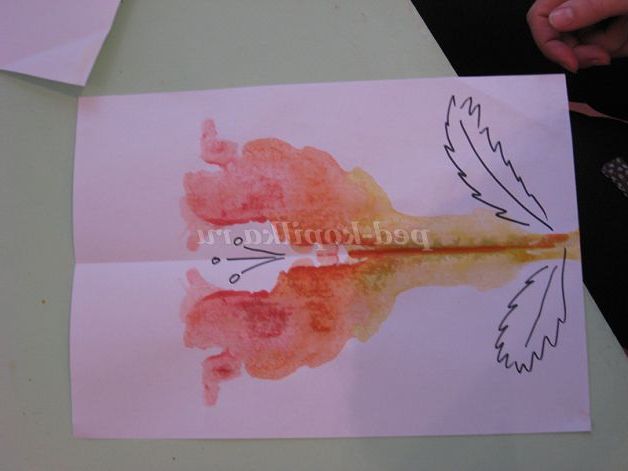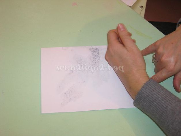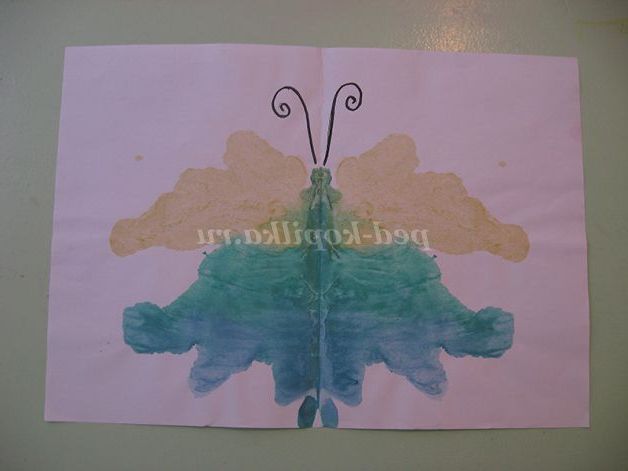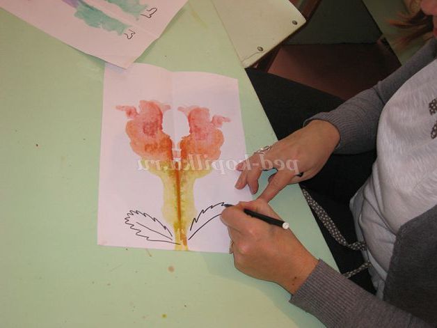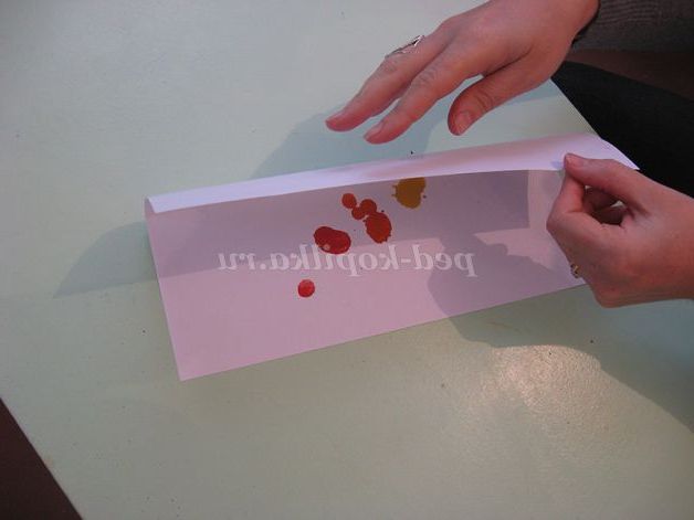 Потім складемо по лінії згину аркуш навпіл і долонькою проведемо кілька разів вгору, вниз, щоб фарба розтеклася по листу. Для «перетворення» плями скажемо чарівні слова.
