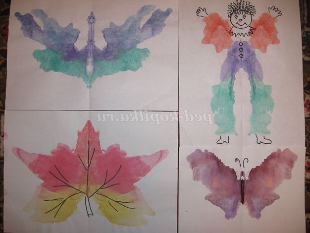 Подумайте, на що це схоже? Пофантазуйте. «Оживіть» плями - перетворіть їх в живі істоти або предмети. Уважно розгляньте плями, повертаючи аркуші паперу в різні сторони. Можна підмалювати олівцем якісь деталі.