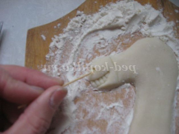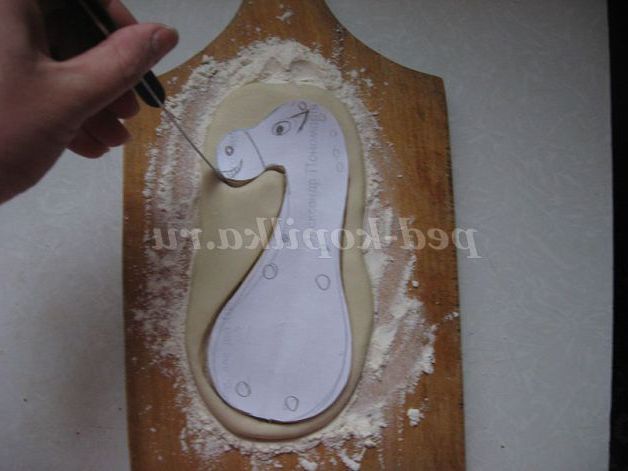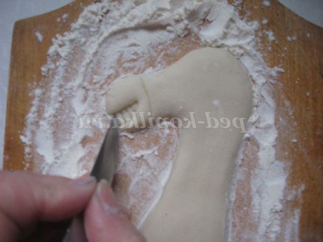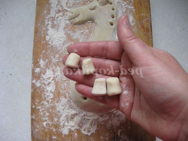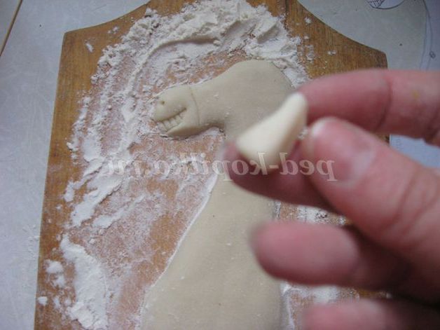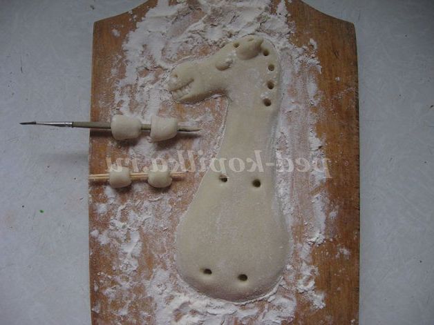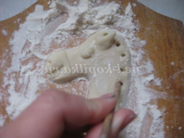 Невеликий шматочок тесту (1 склянка борошна, 0,5 склянки дрібної солі, 0,5 склянки води) кладемо на дошку, обов'язково, посипану борошном і розкочуємо качалкою. Товщина тесту, з якої будемо вирізати конячку, повинен бути приблизно 0,5 див.