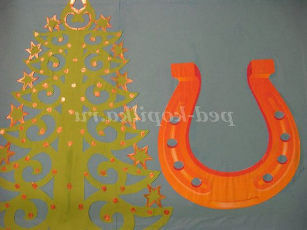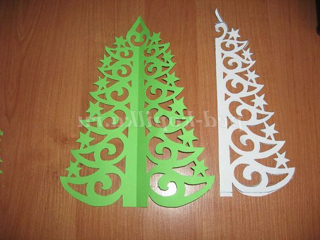 Поки заготівля конячки сохне, займемося художнім вирізуванням з паперу. Підготуйте папір формату А4 зеленого кольору і ескіз ялинки, скопіюйте вподобаний з книги або роздрукуйте з Інтернету, намалюйте самі