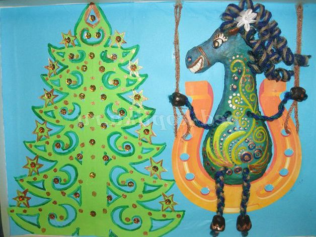 Універсальним приклейте клеєм конячку до основи, розташувавши її на «гойдалки» підкові. Яскраво-зеленою фарбою обвожу контур ялинки.