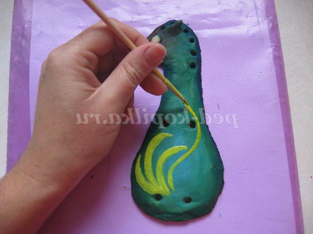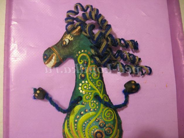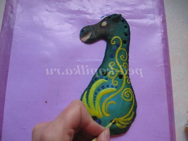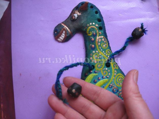 Починаємо фарбувати заготівлю конячки. Приступати до розфарбовування можна тільки тоді, коли тісто охолоне після випалу. Для цього підійдуть будь-які фарби. При цьому можна використовувати фломастери, маркери та ін. Починати треба розфарбовувати з загального фону