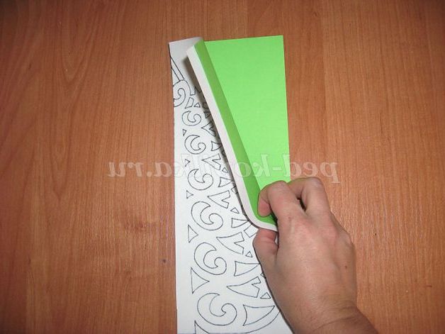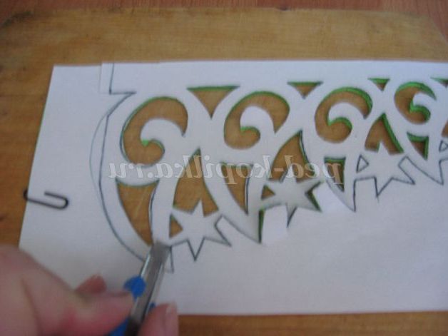 Під папір покладіть дошку або картон, щоб не зіпсувати меблі. Починаємо вирізати канцелярським ножем малюнок з дрібних деталей одного боку, поступово пересуваючись до протилежної. Тиснути на ніж необхідно досить сильно, так як під лезом три шари паперу. При роботі буде досить багато дрібного сміття, а тому заздалегідь приготуйте кошик або пакет