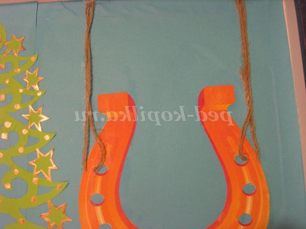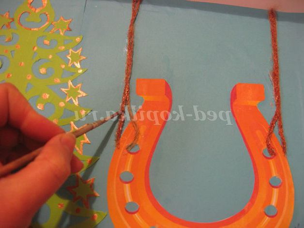 Майструємо «гойдалки». Відріжте чотири однакові нитки (довжина залежить від розміру коробки) по дві на кожній стороні підкови. Приклейте нитки на кожній стороні підкови так, щоб створювалися видимість, ніби вони просмикнуті через отвори на підкові