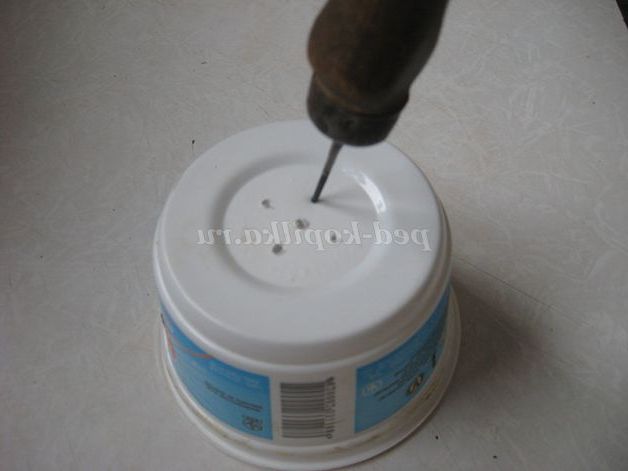 Підготуємо горщик для лука. Переверніть пластикову баночку догори дном. Нагрітим шилом зробіть кілька отворів для дренажу.