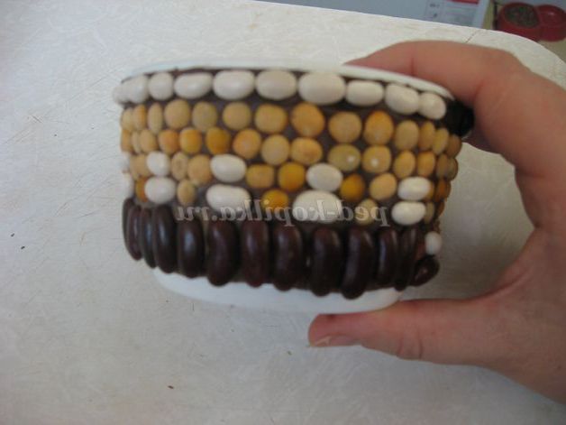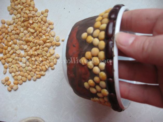 Нанесіть рівномірний шар пластиліну на коробочку. Пластилін буде основою для кріплення насіння, зерен.