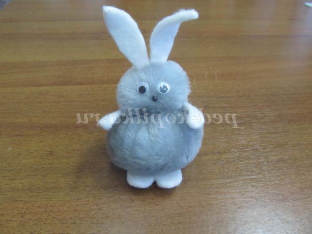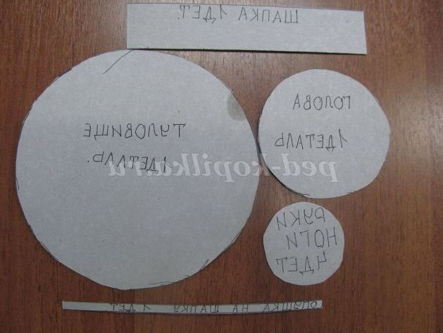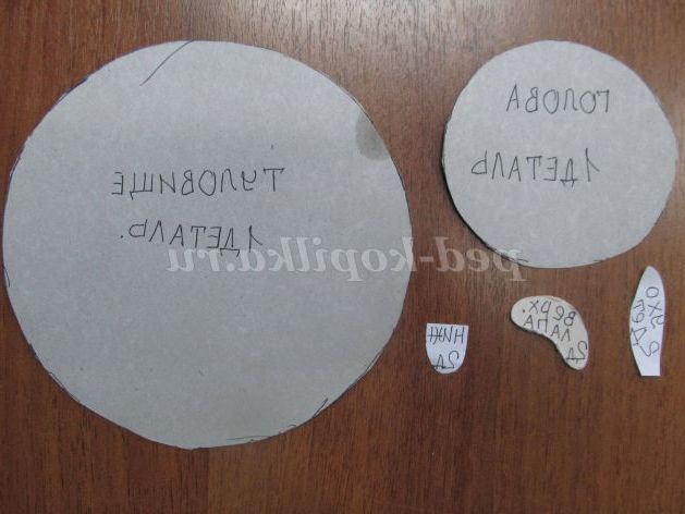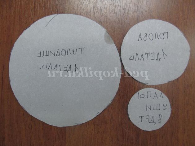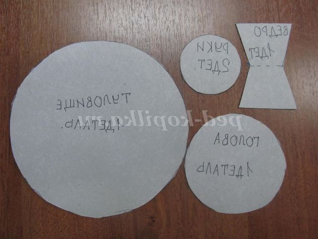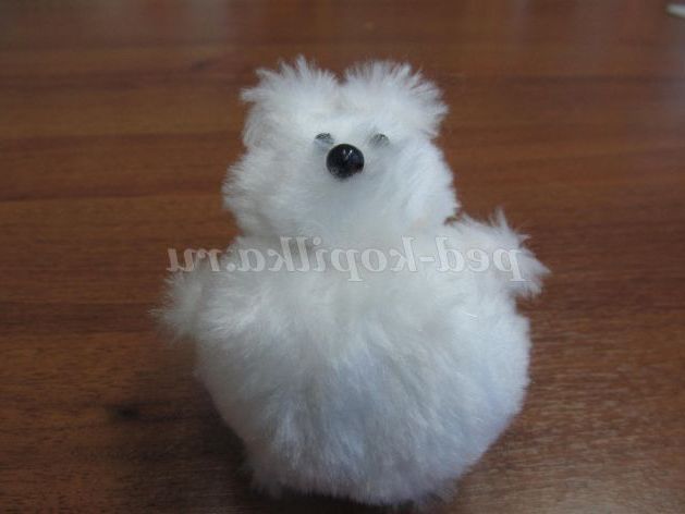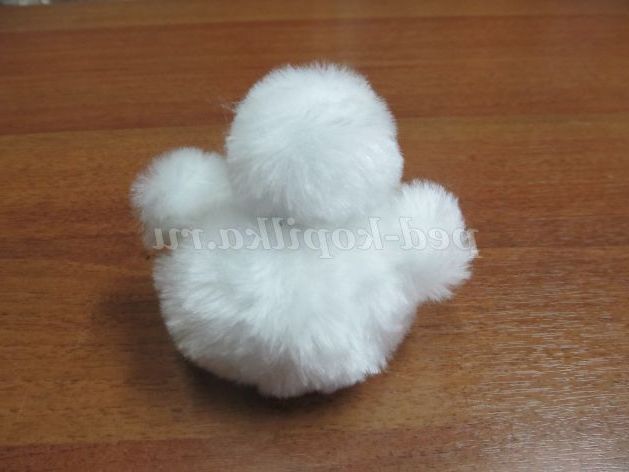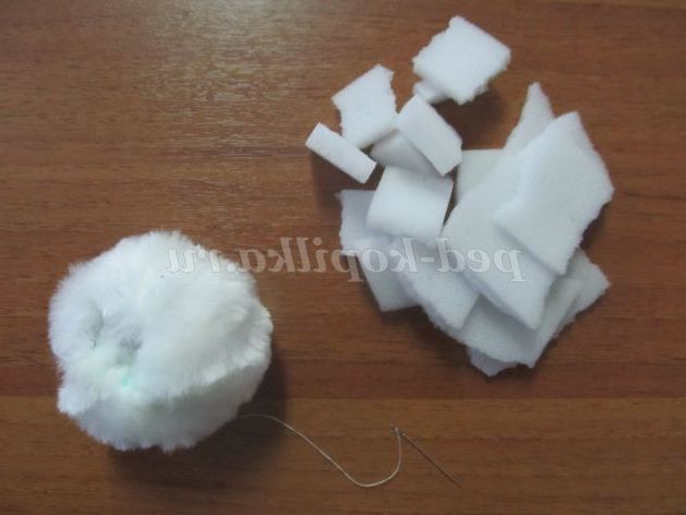 На виворітну сторону штучного хутра розкладаємо викрійки - лекала тулуба, голови, руки-2 шт. Викрійки обводимо гелевою ручкою. На флісі обводимо викрійку відра. Ножицями вирізаємо деталі. Ниткою білого кольору по краю деталі «тулуб», «голова» і «руки» прошити швом «на живушку». Прошиті деталі злегка стягнути, набити поролоном і сильно стягнути. Закріпити ниткою. Вийшло 4 кульки.