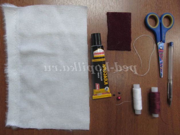 Для виготовлення іграшки Сніговичка нам знадобляться трохи білого штучного хутра - 15х25 см, шматочок флісу бордового кольору 5х8 см, гелева ручка, ножиці, нитки білого і бордового кольорів, голка, викрійки - лекала, набивання поролон, намистинки для очей і носа, клей «Момент».