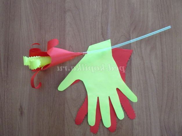 6.тепер загорнемо серединку квітки в іншу паперову долоньку. Паперові квіти зміцнимо на коктейльних паличках.