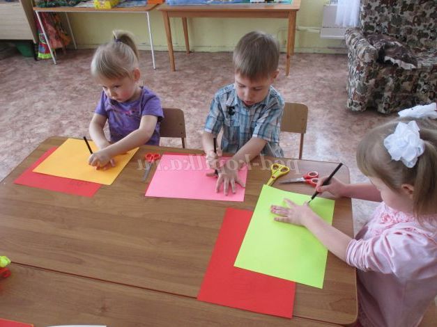 2.Приложите до аркуша кольорового паперу долоньку і обведіть її олівцем.