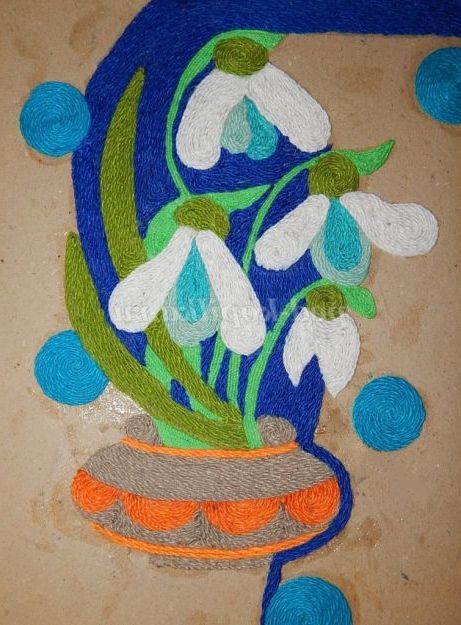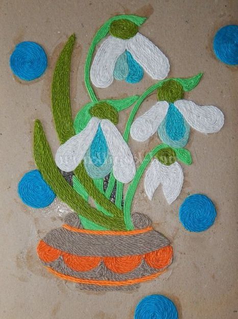 4. На клей викладаємо нитки. «Малюємо» нитками всі елементи, краще від центру формату, до його країв. Там, де кінчається колір, просто обрізаємо нитку ножицями.