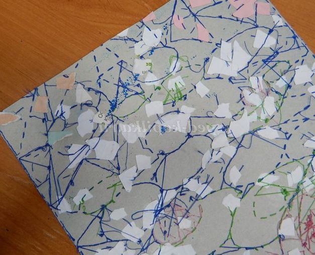 Нитки з виворітного боку закріплюю з допомогою шматочка паперу і клею - олівця.
