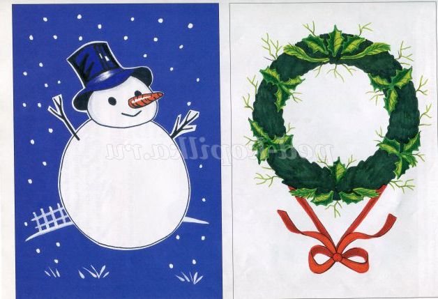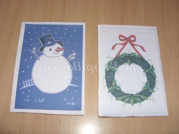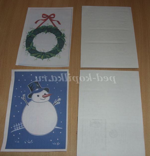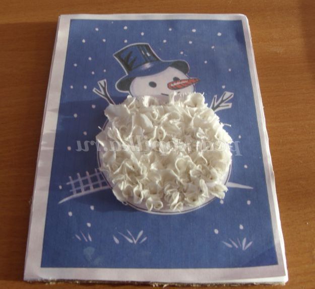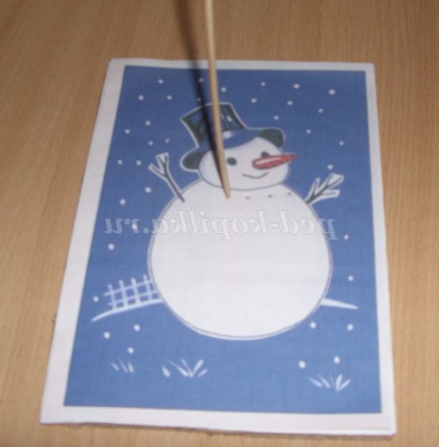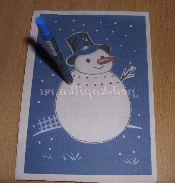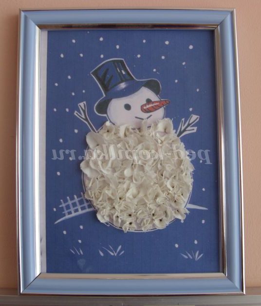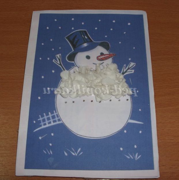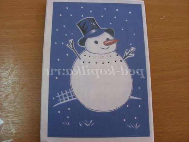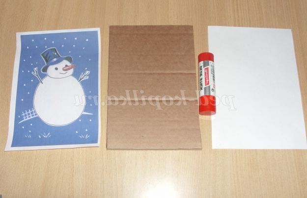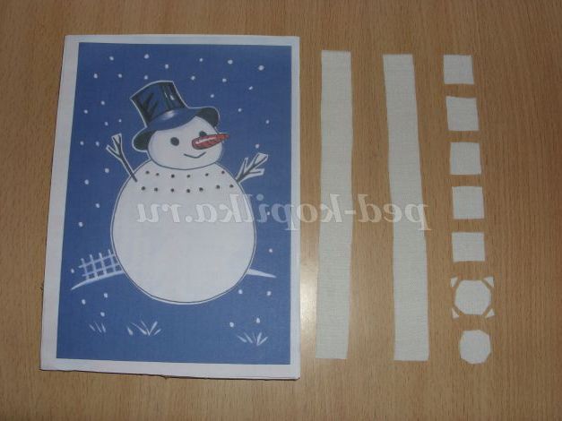 1 етап: Вибираємо картинку ( в даному випадку сніговик). Вирізаємо заготовку за розміром картинки з гофрованого картону і білого паперу для ксерокса.