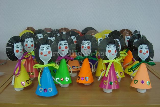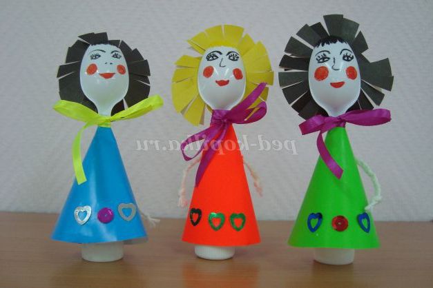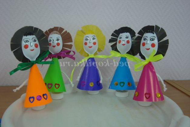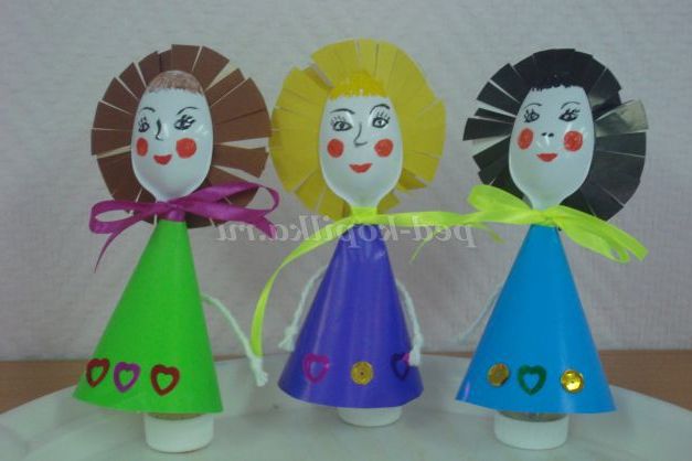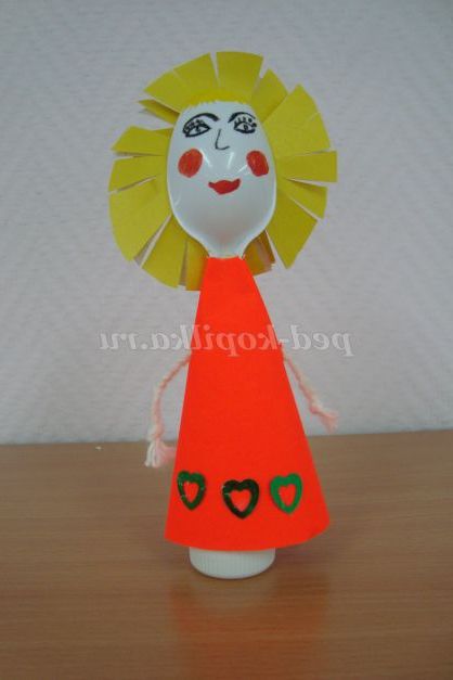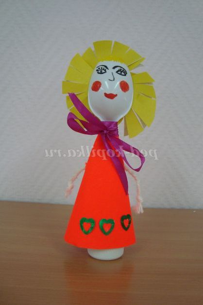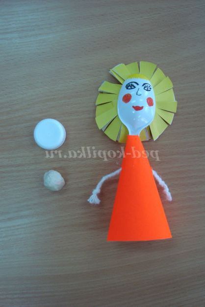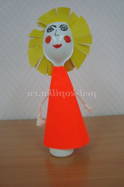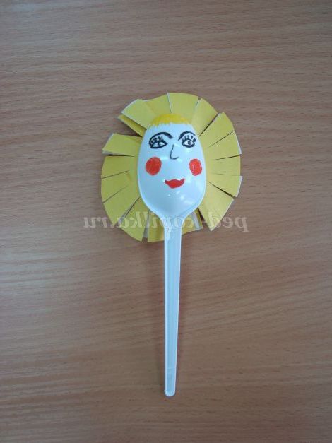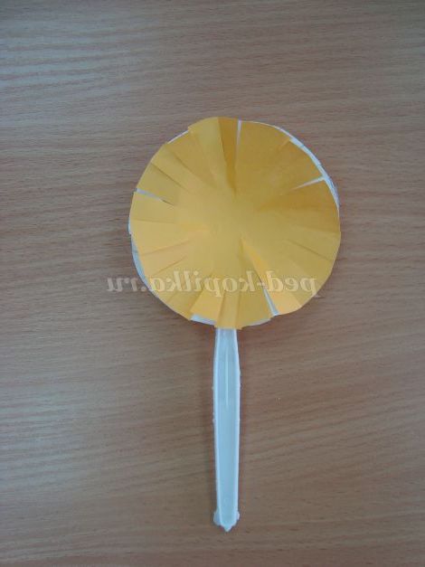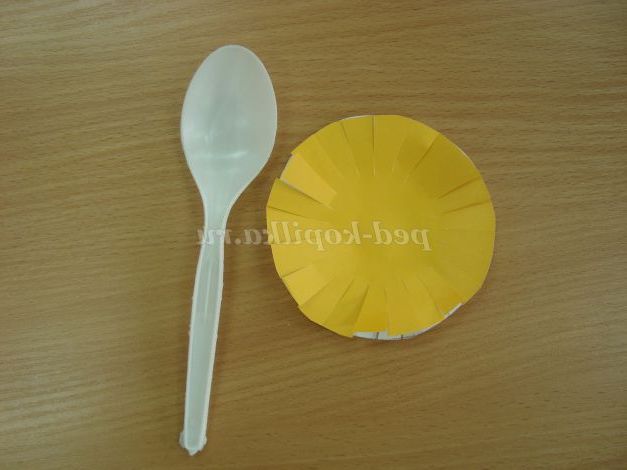 3.Берем одноразову ложку і готову деталь з кольорового паперу. Приклеюємо (волосся) до ложці клеєм.