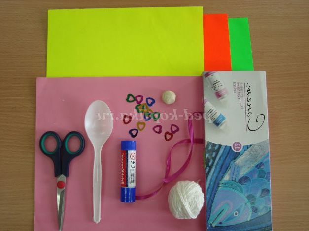 Кольоровий папір, клей - олівець, ножиці, одноразова ложка, пластилін білого кольору, шерстяні нитки, паєтки, атласна стрічка, акрилові фарби, пробки білого кольору від пластмасових пляшок.