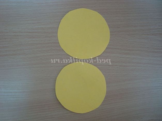 1. Вирізаємо з кольорового паперу (жовтого, коричневого, чорного кольору) 2 кола діаметром 6 - 7 сантиметрів (це будуть волосся для ляльки)