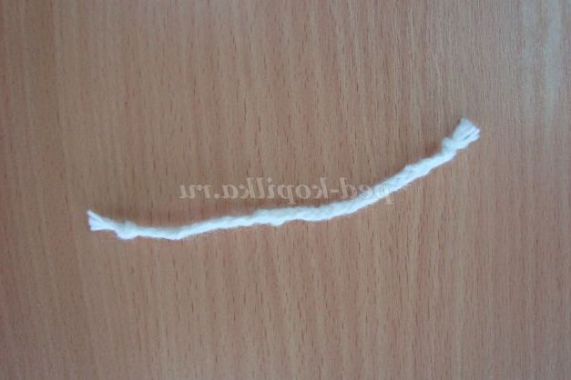 8.Сейчас будемо плести косички - це для ляльки ми зробимо руки. Беремо вовняні нитки і відрізаємо по 15 сантиметрів 3 рази, фіксуємо 3 нитки між собою вузлом і плетемо косу, в кінці кіски знову фіксуємо вузлом.