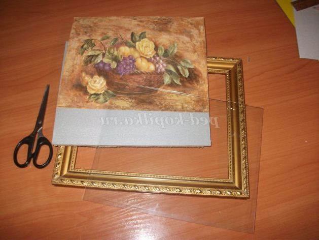 Після того як лак просохне, акуратно накладаємо скло. Між склом і сухим матеріалом не повинно бути повітря, тоді картина довго зберігає свій колір. Щільно притискаємо