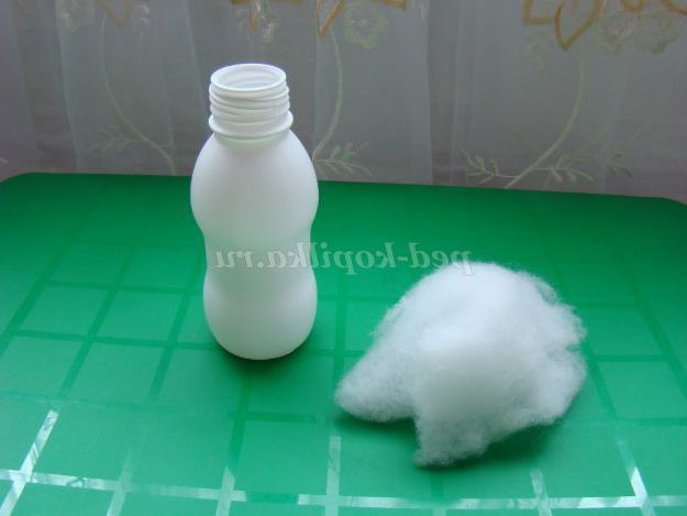 На дно пластикової пляшки кладемо синтепон, щоб квіти у «вазі» краще трималися.