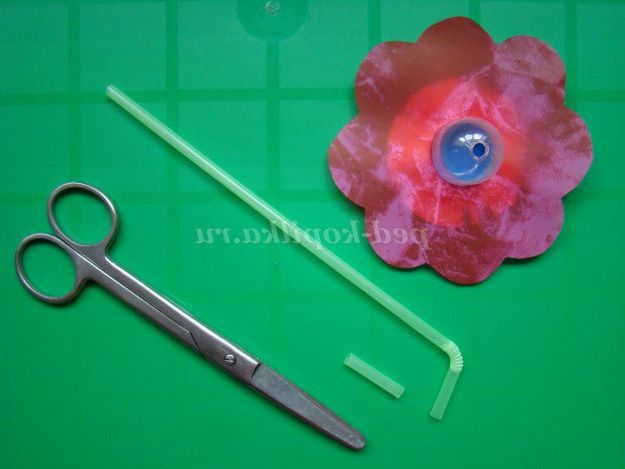 Тепер займемося виготовленням стеблинки. Беремо трубочку для коктейлю, трохи відрізаємо її край і вставляємо в отвір пластикового контейнера.