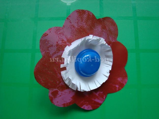 Формуємо верхню частину квітки. Беремо пластиковий контейнер і нанизуємо на нього заготовки круглої форми з надрізаними краями. Вони повинні бути поміщені відразу за кришкою контейнера.