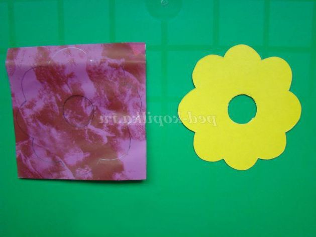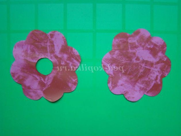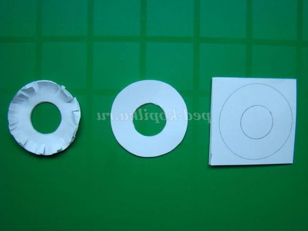 Прикладаємо до паперу круглий шаблон і простим олівцем обводимо. В середині малюємо круглий отвір за допомогою пятирублевой монети. Вирізаємо відразу дві деталі. Надрізаємо краї заготовок по колу, трохи їх «взъерошиваем».