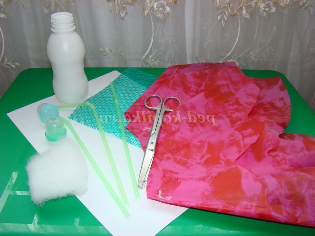Потім вставляємо циліндр із зеленої сітки в пляшечку, розправляємо «листя».