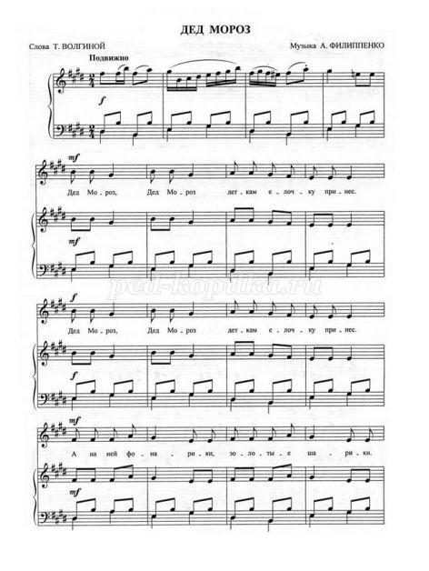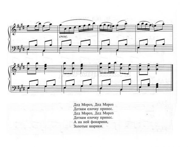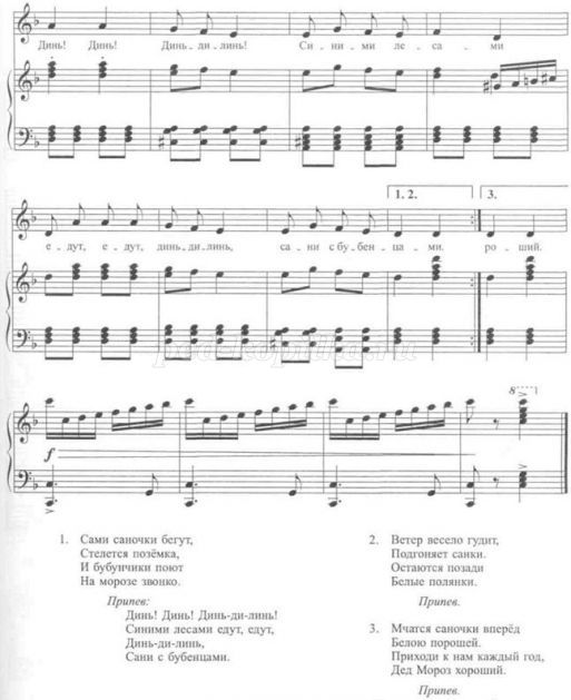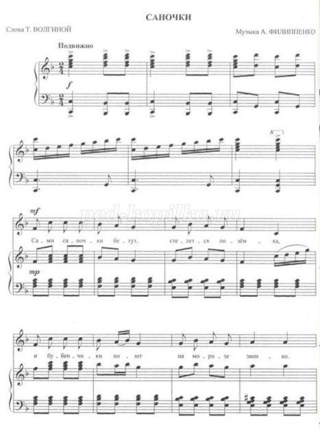 Діти стають у коло навколо Діда Мороза, який тримає в руках дзвіночок. Діти співають пісню «Саночки», музика А. Філіпенка (додаток № 9), а Дід Мороз танцює, дзвенить дзвіночком.