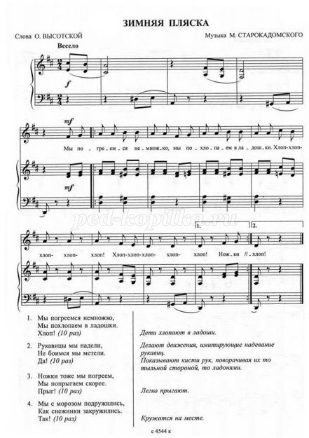 «Зимова танець», музика М. Старокадомського (додаток № 7). Снігуронька співає і показує рухи, діти повторюють.
