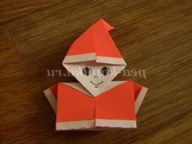 11. Приклеюємо ковпачок до сорочці. Малюємо на білій частині ковпачка оченята, ротик, носик. Дід Мороз готовий.