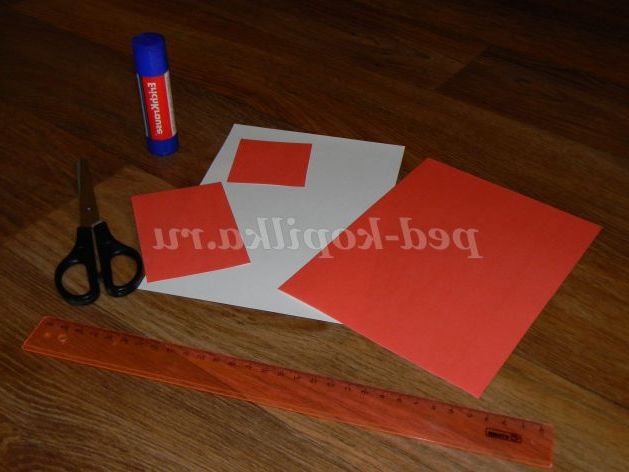 7. Беремо червоний аркуш кольорового паперу, відміряємо на ньому квадрат 6x6, основа для шапочки.