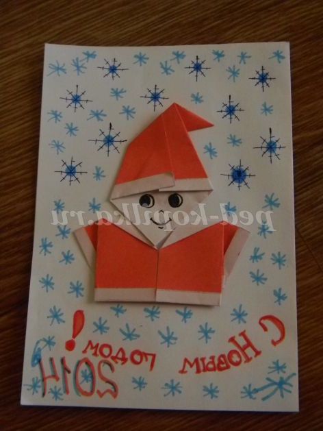 12. Беремо білий аркуш формату А-4, згинаємо його навпіл у вигляді листівки. На першу сторінку приклеюємо нашого Діда Мороза. Листівка готова.