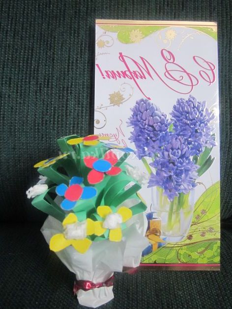 Майстер-клас "Подарунок мамі" проводиться напередодні святкування міжнародного жіночого дня 8 Березня. Весняний букет зроблений руками дитини, що може бути дорожче для люблячої матері.