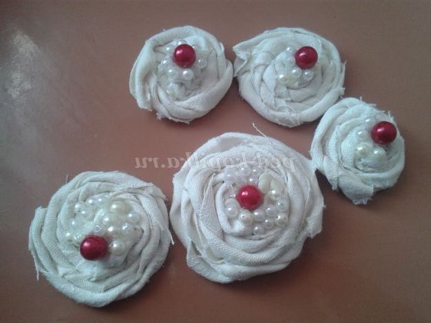 4.Накрутить 5 бутонів, різного розміру. Наклеїти в центр квітки червоної намистину і білий бісер.