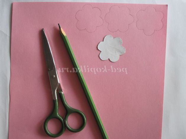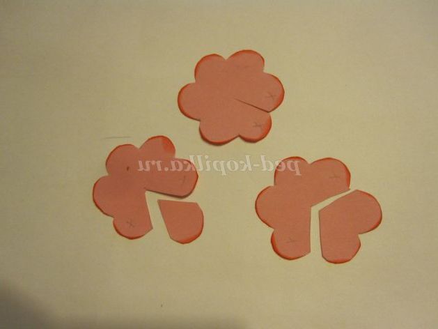 7. Виготовити троянди. Обведіть шаблон квітки 3 рази, вистригти. Попередньо краї пелюсток «затонувати».