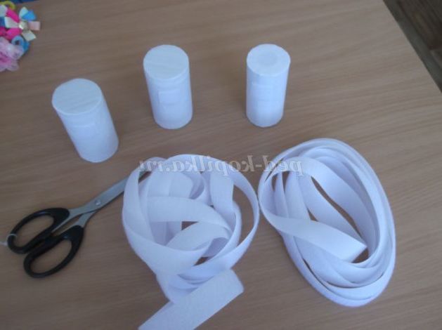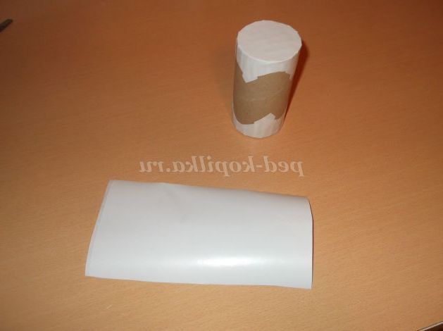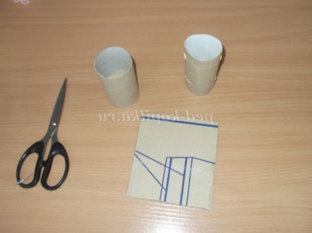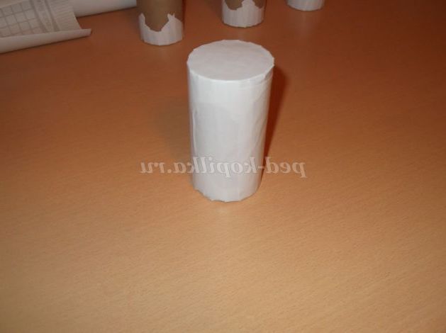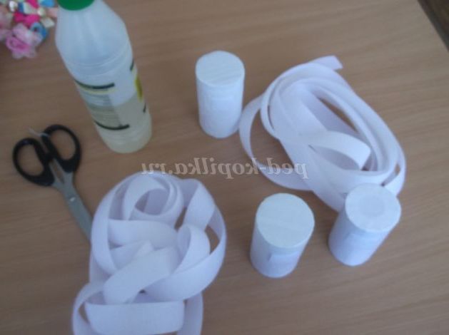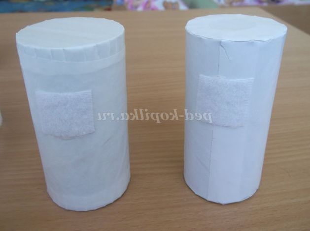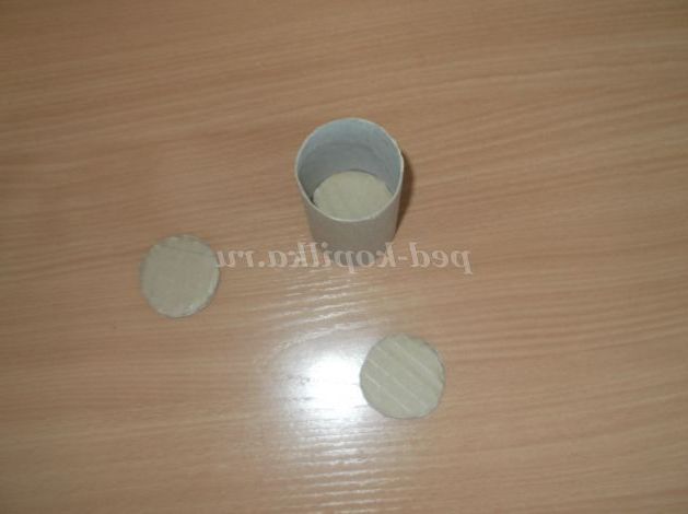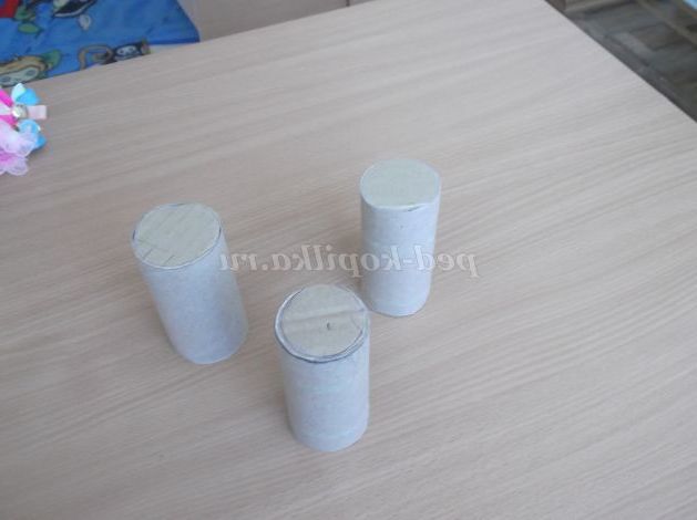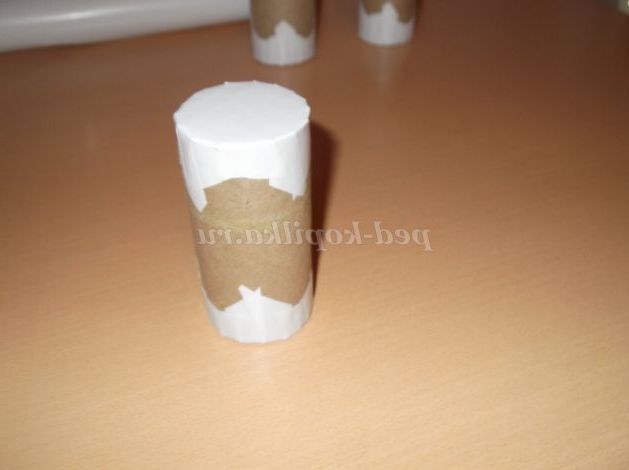5. З клейкої стрічки вирізаємо невеликі квадрати і наклеюємо зверху і знизу на отримані циліндри.