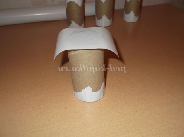 10. З допомогою клею для стельової плитки або рідких цвяхів приклеюємо квадрати до циліндрів ближче до верхнього краю.