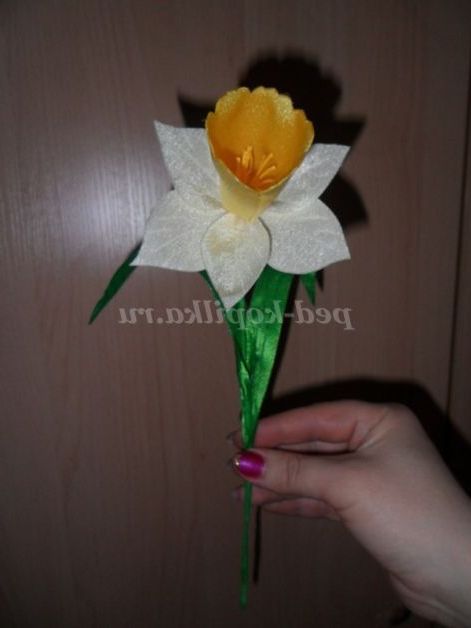 Необхідні матеріали: Тканина креп-атлас білого, жовтого і зеленого кольору, шматочок підкладкової тканини 5х6 див., мідна або алюмінієва дріт для стебла діаметром 2-5 мм, Довжиною 20-25 см, дріт діаметром 0,4-0,6 мм для листів, шаблони деталей квітки з металевої фольги, металева лінійка, клей ПВА, гофрований папір або нитки муліне зеленого кольору.