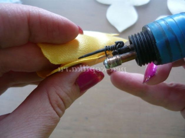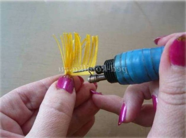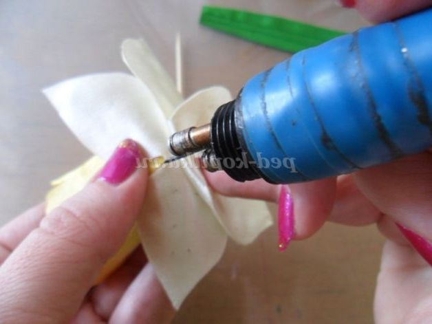 Після цього акуратно прикріплюємо пелюстки до вінець, оплавив краю випалювачем, формуючи квітка.