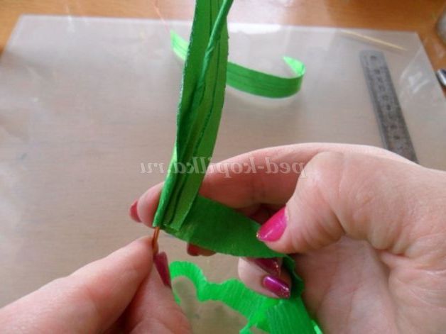 Біля основи квітки фіксуємо смужку гофрованого паперу клеєм ПВА і починаємо обмотувати стебло (при відсутності паперу, стебло можна обмотати нитками «муліне»).