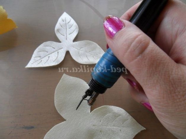 За допомогою випалювача «оживити» пелюстки і листя квітки, нанести прожилки.На листі робимо прожилки таким чином, щоб посередині утворилася "кишеня" для розміщення в ньому дроту.