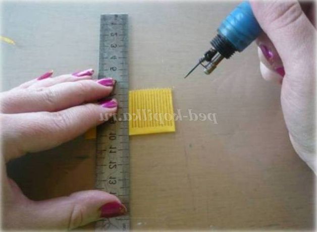 Приступаємо до скріплення нижнього краю віночка. Складаємо нижні краї попарно і за допомогою металевої лінійки, притискаючи їх один до одного, споюємо випалювачем. Так само споюємо інші зрізи.