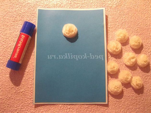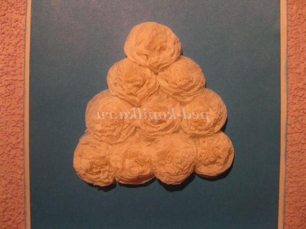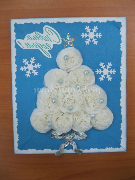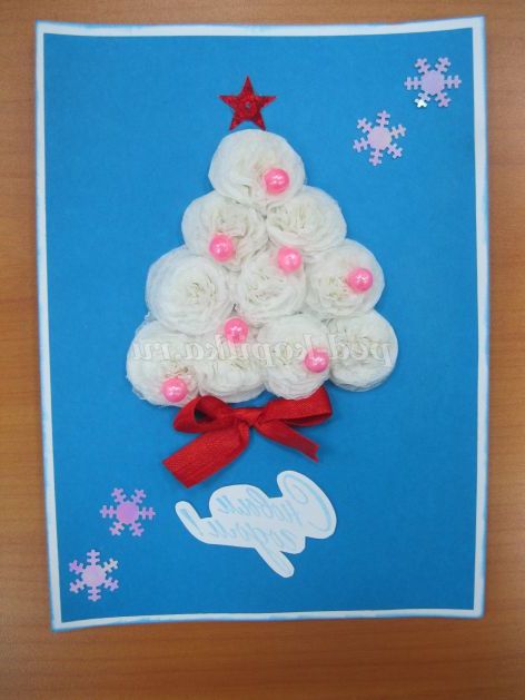 Зимові свята не обходяться без новорічної красуні. Крім звичного зеленого кольору, новорічні ялинки бувають білими, сріблястими, золотистими. Ось і ми з вами на нашій новорічній листівці зробимо білу пухнасту ялинку з гофрованого паперу.